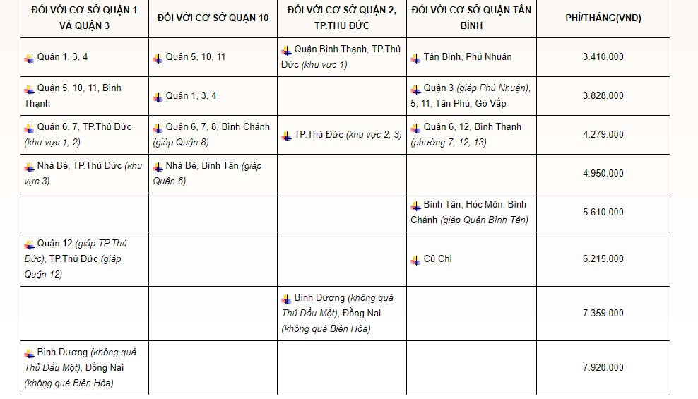 Dĩ nhiên chi phí đi lại giữa các quận sẽ là khác nhau, và có dao động từ 3.410.000/tháng đến 7.920.000/tháng theo bảng sau: